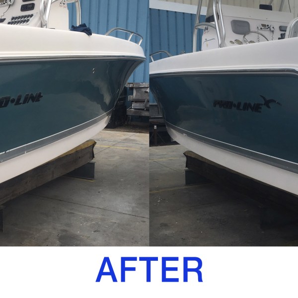 Above is an example of the Detail Department’s Wet Sanding Application. After wet sanding, we apply a heavy grit compound, wax and sealant to protect the longevity of the fiberglass. This helps with heavily oxidized boat hulls and restore your vessels to near new condition.